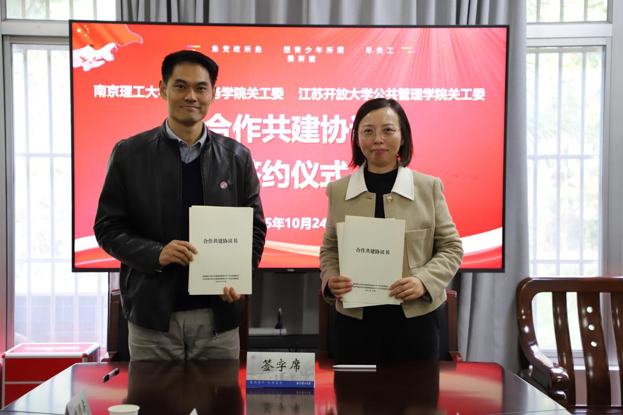 秋意渐浓,情谊正暖。10月24日上午,江苏开放大学公共管理学院与南京理工大学公共事务学院关心下一代工作委员会合作共建签约仪式在南京理工大学举行。仪式由南京理工大学离退休党委常务副书记、关工委秘书长刘明梁主持,南京理工大学关工委常务副主任项银康、江苏开放大学关工委常务副主任金丽霞及两校关工委、学院相关负责同志齐聚一堂,共同见证这一重要时刻。